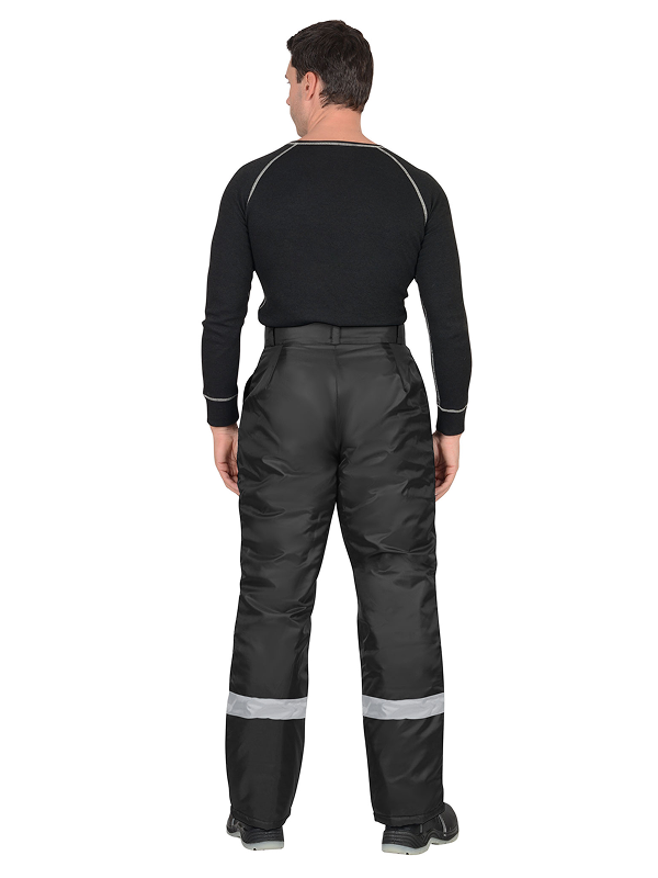Брюки прямые на утеплённой подкладке, с застежкой спереди на гульфик с молнией. Брюки с широким поясом с застежкой на 2 пуговицы, с боковыми накладными карманами с наклонным входом. В брюках предусмотрена светоотражающая лента для обозначения сигнальной видимости.