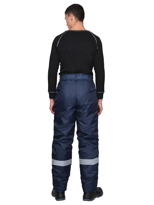 Брюки прямые на утеплённой подкладке, с застежкой спереди на гульфик с молнией. Брюки с широким поясом с застежкой на 2 пуговицы, с боковыми накладными карманами с наклонным входом. В брюках предусмотрена светоотражающая лента для обозначения сигнальной видимости.