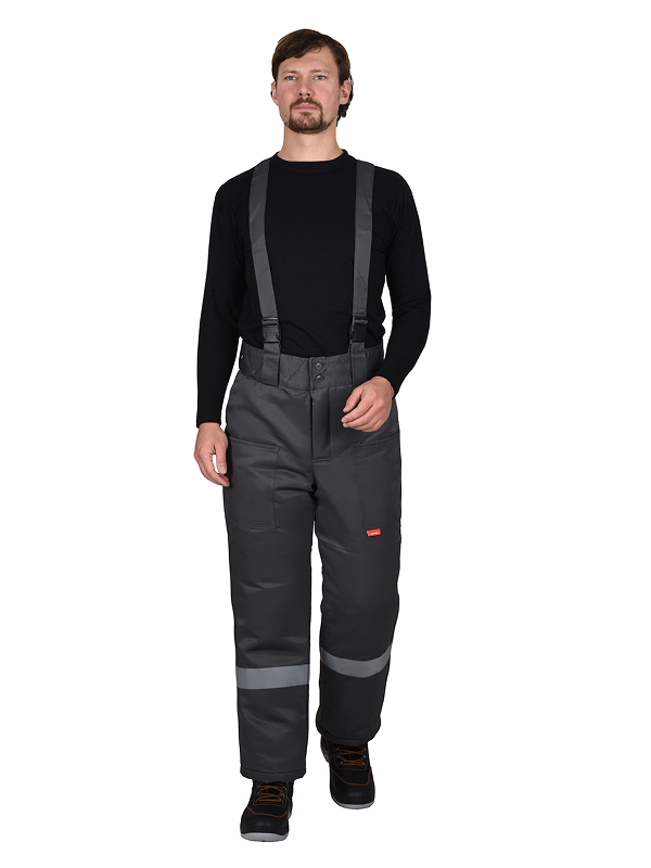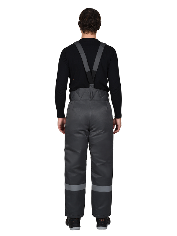 Брюки прямые на утеплённой подкладке, с застежкой спереди на молнию – гульфик. Брюки с широким поясом с застежкой на 2 пуговицы, с боковыми накладными карманами, со съёмными бретелями. Бретели пристегиваются к брюкам при помощи пуговиц и петель, регулируются по длине защелками-фастексами. По низу брюк предусмотрена лента светоотражающая ш.50 мм для обозначения сигнальной видимости в тёмное время суток.