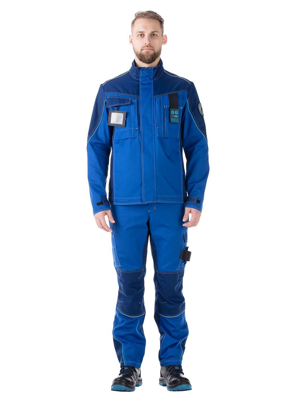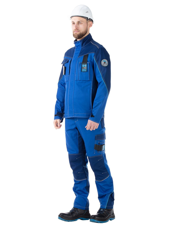 В области боковых швов брюк на уровне середины бедер расположены карманы с отделениями для средств связи и инструментов. Швы членений костюма подчеркнуты световозвращающими кантами двух цветов.