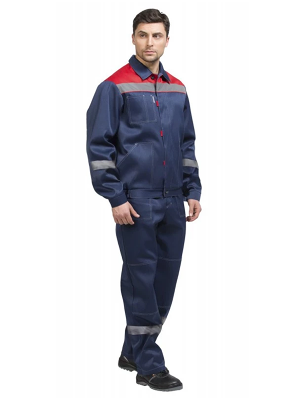 Куртка с супатной застежкой на пуговицы. Эластичная регулировка объема по низу куртки рабочего костюма. Нагрудный карман с отделением для ручки. Накладные карманы в нижней части куртки. Воротник отложной. Рукава у костюма рабочего втачные с манжетами на пуговицах и усилительными накладками на локтях.