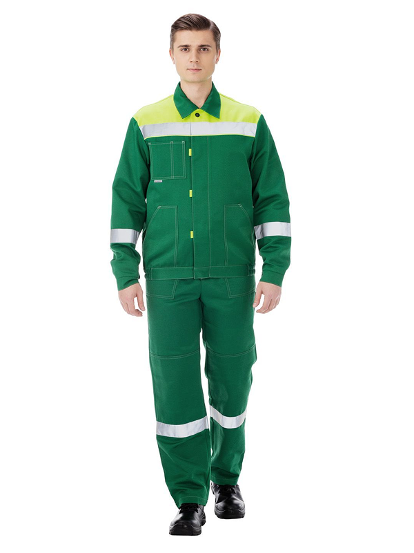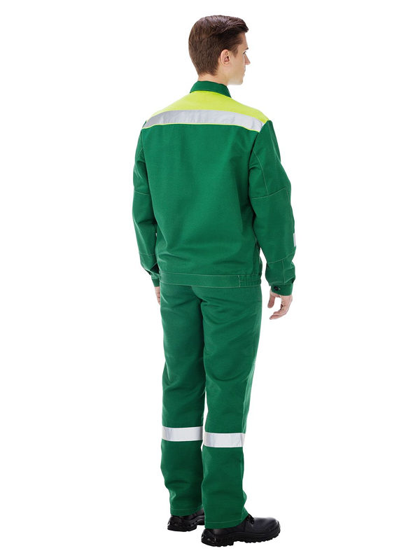 По низу кокеток, на рукавах куртки и по низу брюк широкие световозвращающие (светоотражающие) полосы, благодаря чему данная спецодежда приобретает защитные свойства в условиях плохой видимости.