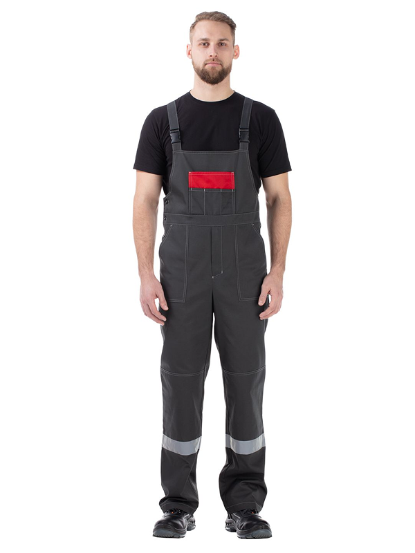 — накладные карманы с косыми входами спереди на полукомбинезоне, в области груди карман с несколькими отделами,