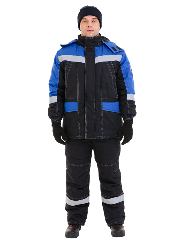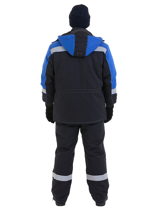 - Капюшон: съёмный, утеплённый, с козырьком (васильковые бока, чёрная середина).