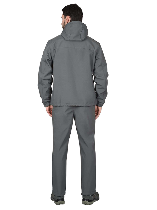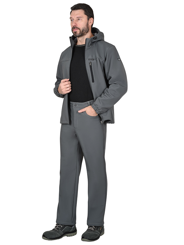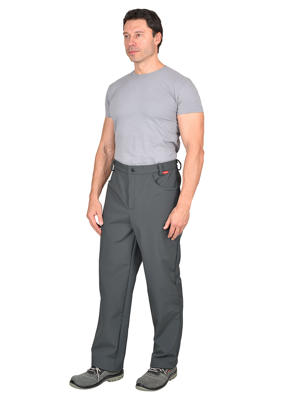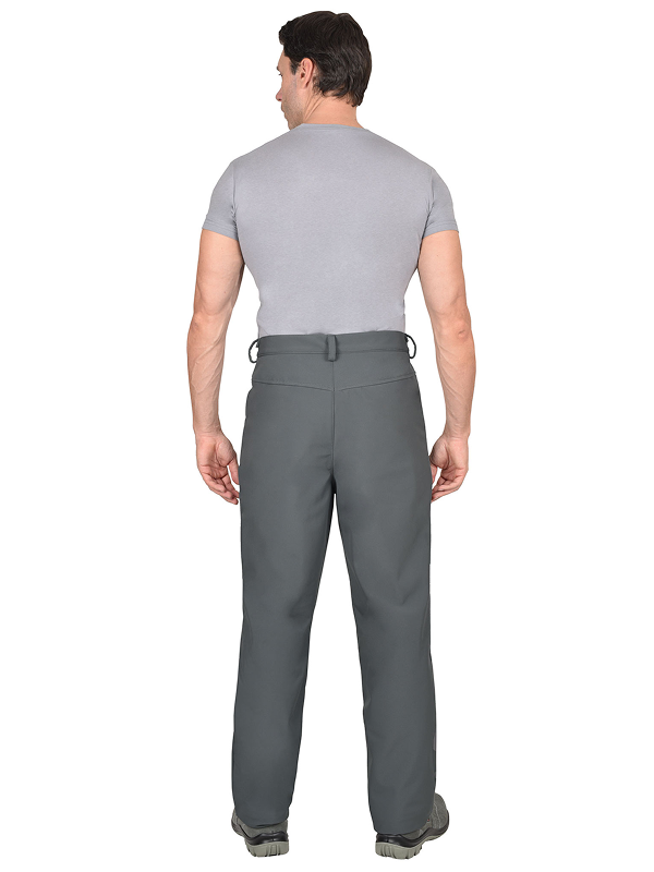 Брюки прямые, на притачном поясе, с застёжкой спереди гульфик на тесьму «молния». Брюки с боковыми внутренними карманами фигурным входом, на задних половинках с отрезной кокеткой. Ткань верха — «Софтшелл» состав: 100% п/э.; пл. 350 г/м ГОСТ 25295-2003