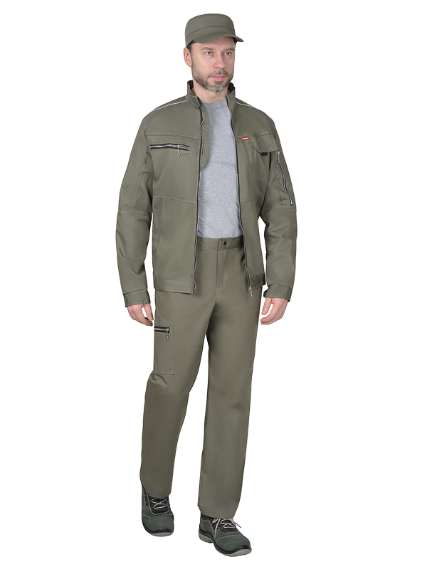 Брюки прямого покроя; с центральной застежкой гульфика на тесьму — «молния», с притачным поясом, застёгивающимся на кнопку; Передние половинки с внутренними боковыми карманами с наклонным входом, нижние углы карманов закреплены закрепками отделочными нитками и хольнитенами. Задние половинки с двумя накладными карманами с нижним объемом. На правом боковом шве брюк настрочен карман, с горизонтальным входом в карман, застёгивающийся на металлическую тесьму «молнию». Притачной пояс с пятью шлевками, 2 шлевки по середине на передних половинках брюк, 2 от боковых швов на 3 см и 1 по центру среднего шва.