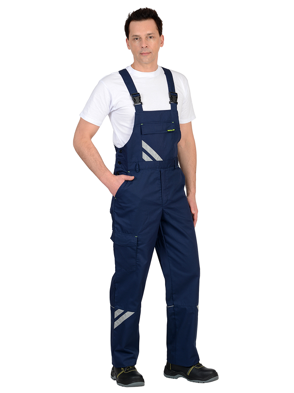 Полукомбинезон застежкой гульфика на тесьму — «молния» с боковой застежкой на пуговицы, с различными функциональными карманами, с элементами из СВ кант и СОП, обеспечивающие безопасность работы в условиях пониженной видимости.