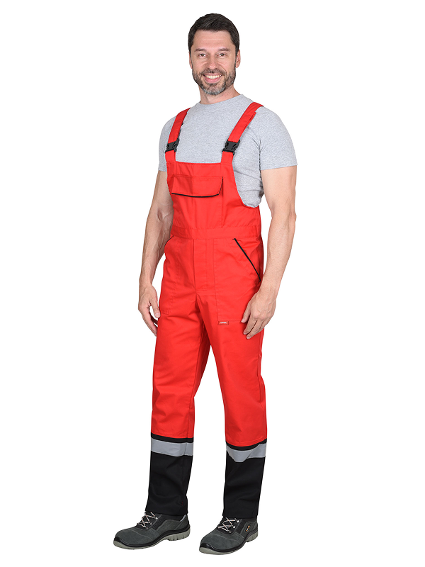 Полукомбинезон прямого силуэта, с застежкой на пуговицы спереди (гульфик) и в правом боковом шве. Сзади полукомбинезон по талии частично стянут резинкой для лучшего прилегания по фигуре. Полукомбинезон спереди с боковыми карманами и нагрудным карманом с клапаном, сзади с двойным карманом для инструментов у правого бокового шва на уровне колена. Полукомбинезон с бретелями с резинкой, длина бретелей регулируется застежкой-фастексом.