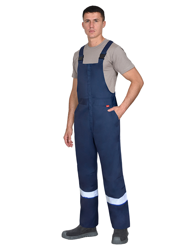 Полукомбинезон с центральной застёжкой в среднем шве передних половинок на молнию, накрытую ветрозащитным клапаном от верха нагрудника. Полукомбинезон с внутренними боковыми карманами, с накладками со стороны задних половинок, со стяжкой на резинку по линии талии спинки. Полукомбинезон с бретелями, длина которых регулируется. Понизу полукомбинезона предусмотрена лента светоотражающая 50 мм для обозначения сигнальной видимости.