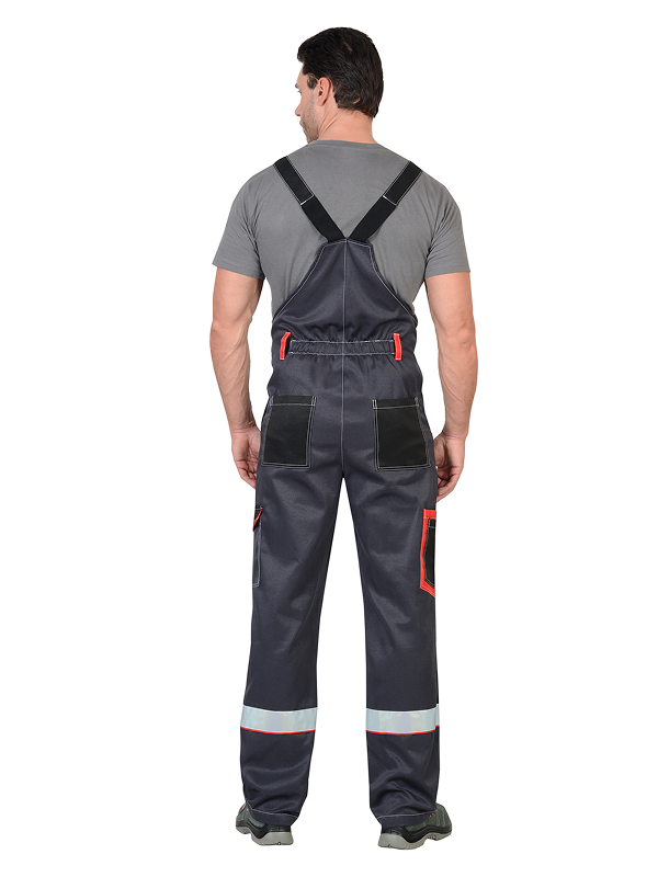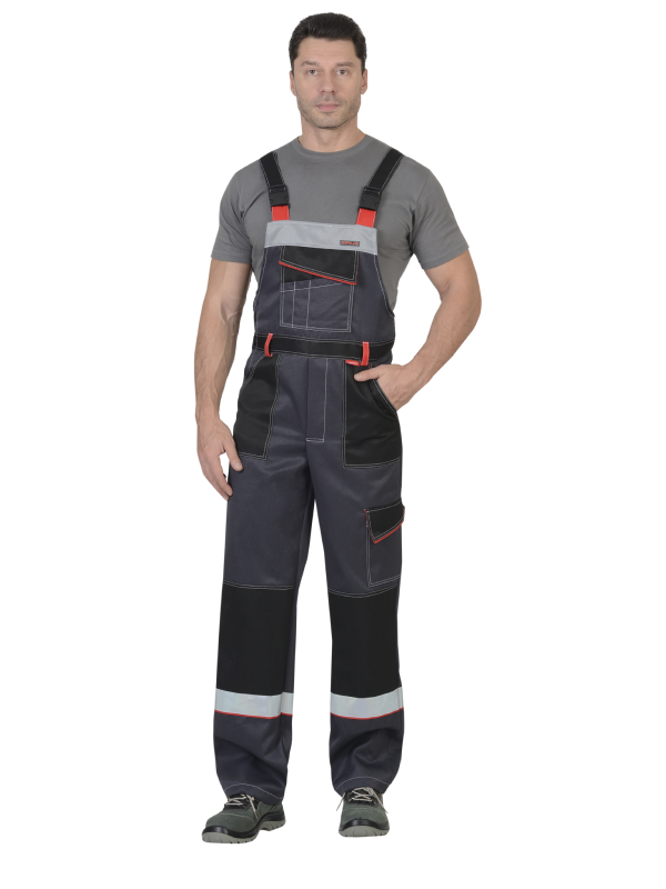 Полукомбинезон с застежкой на пуговицы: гульфик и левая боковая застежка. На грудке комбинированный карман с клапаном, застегивается на липучку и кнопку. Передние половинки с боковыми карманами и наколенниками. На левом боковом шве передних половинок накладной карман с клапаном, застегивается на липучку и кнопку. Задние половинки с накладными карманами и карманами для инструментов. По спинке резинка для лучшего прилегания. Полукомбинезон с бретелями, длина регулируется резинкой и застежкой-фастексом.