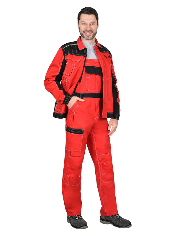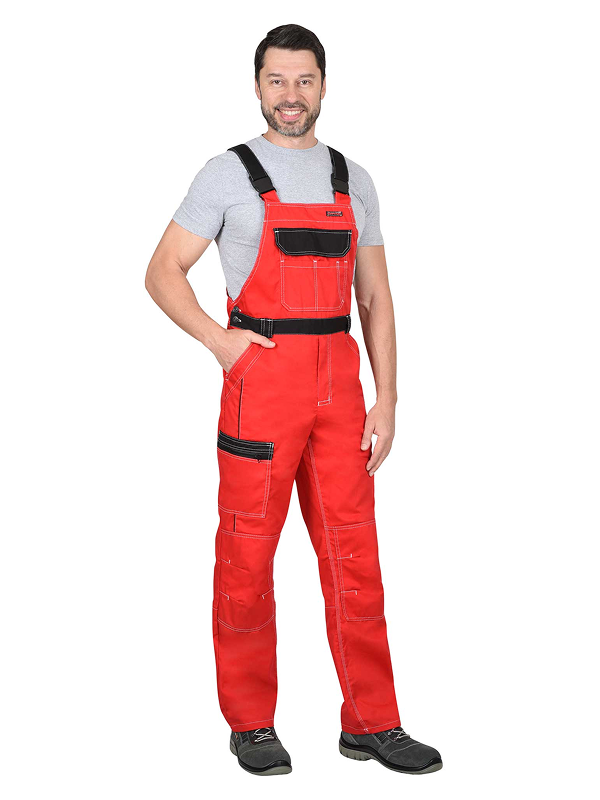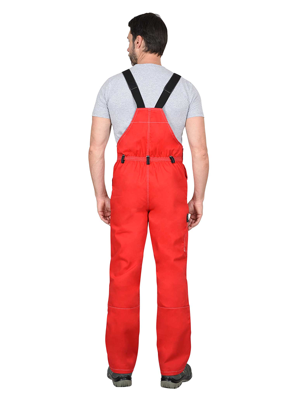 Полукомбинезон прямого силуэта с застежкой гульфика на молнию, различными многофункциональными карманами, застежкой в правом боковом шве на пуговицы, наколенниками и бретелями регулируемыми эластичной тесьмой и фастексами, с эластичной тесьмой по линии талии. На передних половинках в рельеф вшивается СВ кант.
