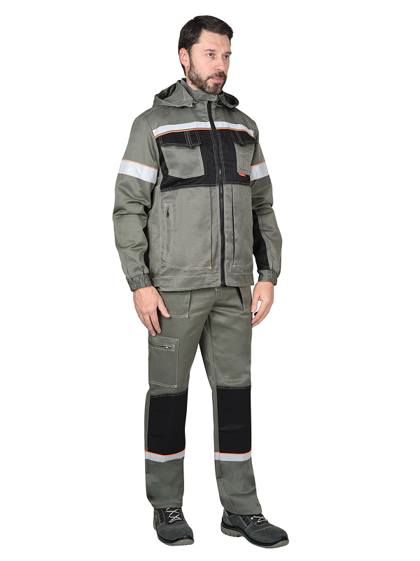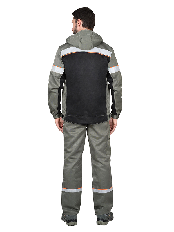 Куртка прямого силуэта, укороченная, с удлиненной фигурной спинкой, с центральной застёжкой на тесьму — «молния» однозамковую до верха, с подпланкой, воротником стойка, с пристёгивающимся капюшоном на молнию и верхними и нижними карманами. Ширина куртки по низу регулируется хлястиком на липучке. Изделие с втачными рукавами и притачной манжетой с частичной стяжкой на резинку ткацкую. В куртке предусмотрен кант контрастного цвета и ленты светоотражающей СОП (мелкодисперсной белой) ш.25 мм и 50 мм для обозначения сигнальной видимости.