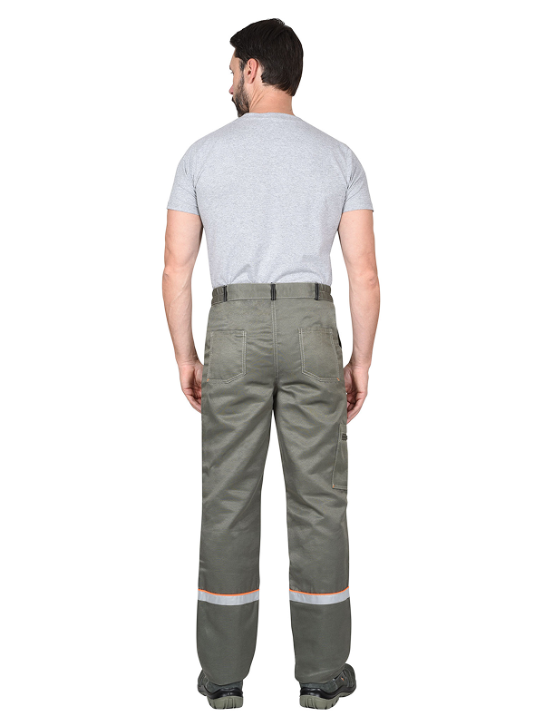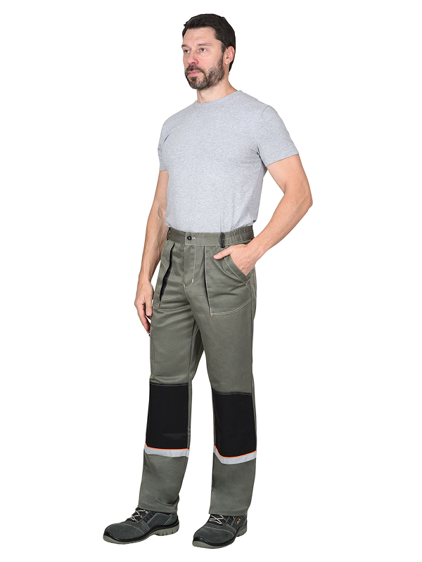 Брюки прямые, на притачном поясе с резинкой ткацкой по боковым швам, застёгивающимся на петлю и пуговицу, с 5-ю шлевками, с застёжкой гульфика на молнию, с накладными боковыми и задними карманами и карманом на правом боковым шве, с наколенниками. В брюках предусмотрен кант контрастного цвета и ленты светоотражающей СОП (мелкодисперсной белой) ш.25 мм для обозначения сигнальной видимости.