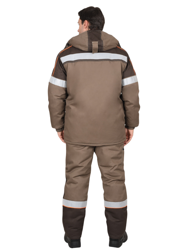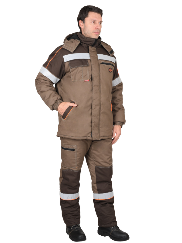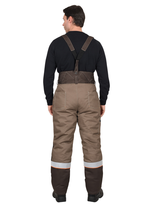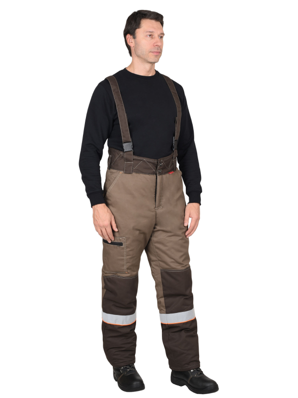 БРЮКИ прямые, с бретелями, с притачной утеплённой подкладкой, с центральной застежкой гульфика на тесьму «молния», широким фигурным поясом, с застежкой на поясе на две пуговицы, с тремя узкими шлевками на задних половинках и двумя щлевками-держателями фастексов на передних половинках. Внутренние боковые карманы с наклонным входом, с накладным карманом на правом боковом шве, застегивающимся на тесьму «молния». Наколенники на передних половинках, накладные задние карманы. СОП 50мм для обеспечения видимости. ГОСТ 12.4.303-2016