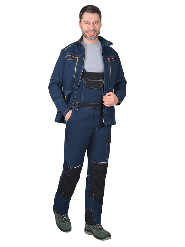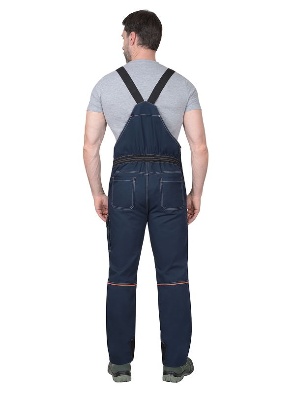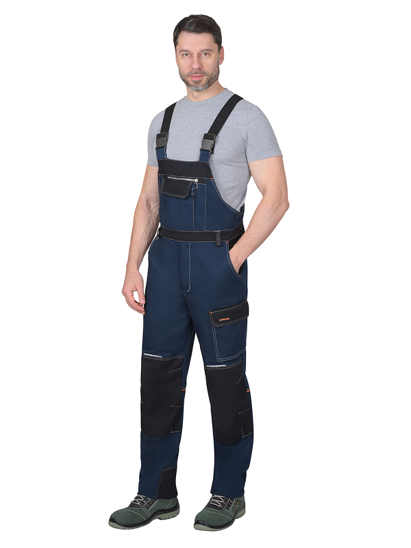 Полукомбинезон с застежками: гульфик на молнию, левая боковая на кнопки. На грудке многофункциональный комбинированный карман с клапаном на липучку. Передние половинки с боковыми внутренними карманами и объемными наколенниками. На левом боковом шве накладной полуобъемный карман с фигурным клапаном на липучку. Задние половинки с кантом контрастного цвета, кокеткой и накладными фигурными карманами. По шаговым швам брюк усиленные фигурные накладки. Пояс брюк с широкими шлевками. По шаговым швам полукомбинезона усиленные фигурные накладки. По спинке на всю ширину резинка для лучшего прилегания. Полукомбинезон с бретелями из резинки, длина регулируется застежкой-фастексом.