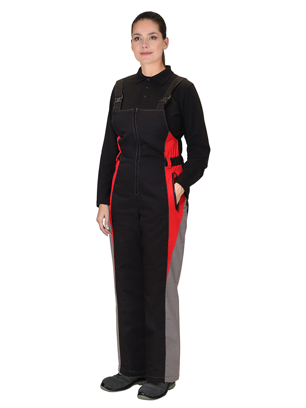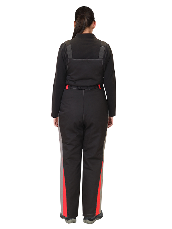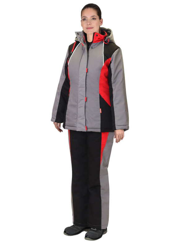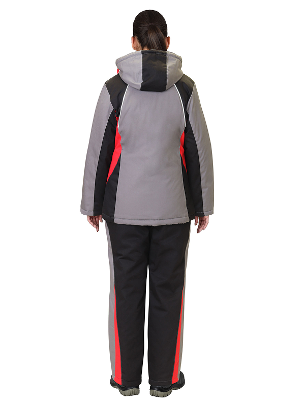 Куртка с притачной утеплённой, стеганой подкладкой, удлиненная, полуприлегающего силуэта, с воротником стойка, с центральной застёжкой на тесьму — «молния» до края воротника, накрытой ветрозащитной планкой, с нижними боковыми карманами в рельефных швах. Рукава втачные, с внутренними трикотажными манжетами. В куртке предусмотрен светоотражающий кант для обозначения сигнальной видимости. Куртка со съёмным капюшоном, пристёгивающимся на тесьму молния. Полукомбинезон с центральной застёжкой на молнию, с прорезными карманами с молнией, с настрочным поясом с внутренней резинкой. Полукомбинезон с бретелями, длина которых регулируется резинкой и фастексами.