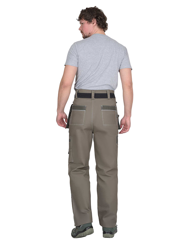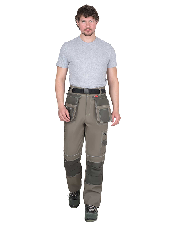 Брюки выполнены из ткани «Канвас Комфорт», прямого силуэта, с притачным поясом, с застежкой гульфика на молнию, с различными многофункциональными карманами и объёмными наколенниками. В брюках предусмотрен ремень из резинки ременной «Сириус» застегивающийся на защелку-фастекс.