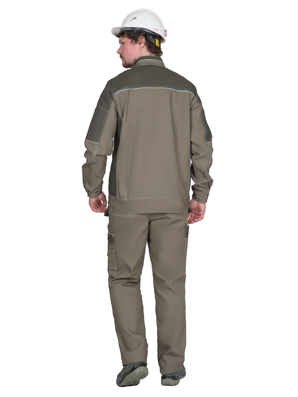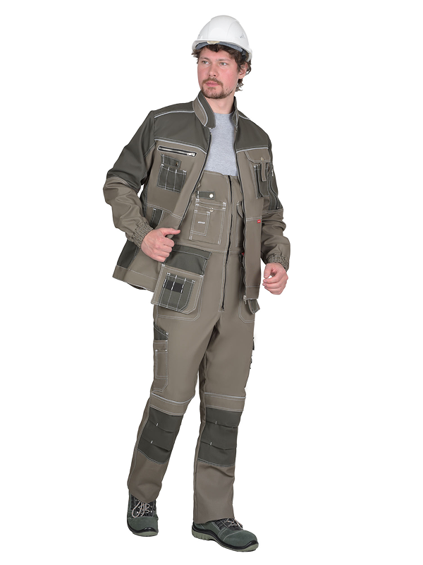 Куртка из ткани «Канвас Комфорт», прямого силуэта, с центральной застежкой на металлическую молнию, воротник — «стойка», с различными многофункциональными карманами. Рукава втачные, левый с накладным карманом с застежкой на металлическую молнию, с притачными манжетами, частично стянутыми резинкой. В куртке предусмотрен кант СВ 3мм светоотражающий 100 К для обозначение видимости. На средней части левой полочки выполнены 2 кармана, настроченные один на другой с фигурным клапаном, застегивающимся на 1 кнопку. На средней части правой полочки в шве кокетки прорезной карман, в рамку, застегивающийся на металлическую молнию и накладной карман, разделенный на три секции с патой на кнопку. Нижние части полочек с прорезными карманами в листочку с наклонным входом. Воротник – «стойка» с кантом СВ 3 мм. Пояс фигурный формы.
