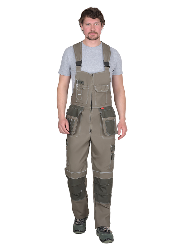 Полукомбинезон из ткани «Канвас Комфорт», прямого силуэта, с центральной застежкой на тесьму молнию R-вида, с различными многофункциональными карманами, с кулисой по спинке на резинку ткацкую, с объёмными наколенниками и бретелями регулируемыми резинкой помочной и фастексам. В полукомбинезоне вшивается кант СВ 3 мм светоотражающий 100 К для обозначение сигнальной видимости.