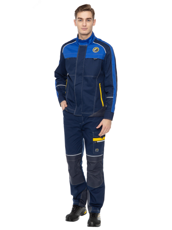 Брюки эргономичной формы с застежкой на молнию и металлическую пуговицу. Пояс с широкими шлевками, в том числе из стропы, и с полукольцом. На передних половинках верхние боковые карманы и карманы на коленях для амортизационных вкладышей. На задних половинках сложная кокетка, верхние накладные карманы и карманы для инструментов. На левой брючине в области середины бедра накладной карман с клапаном и отделом на молнии. Съемный пояс из ременной стропы на пластиковой пряжке. Световозвращающие канты на рукавах и кокетках куртки, над коленями и на кокетке брюк. По низу боковых частей и в области локтей куртки, а также в области коленей, задних карманов и низа брюк усилительные накладки из прочного материала.