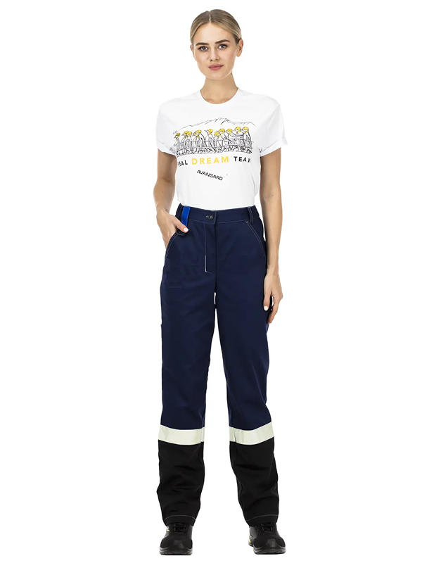 Брюки с застежкой на гульфик с молнией, с поясом со шлевками. На поясе эластичные вставки по бокам для регулировки объема. На передних половинках верхние карманы с боковым входом. На задних половинках верхние накладные карманы с объемом в нижней части и карманы для инструментов.