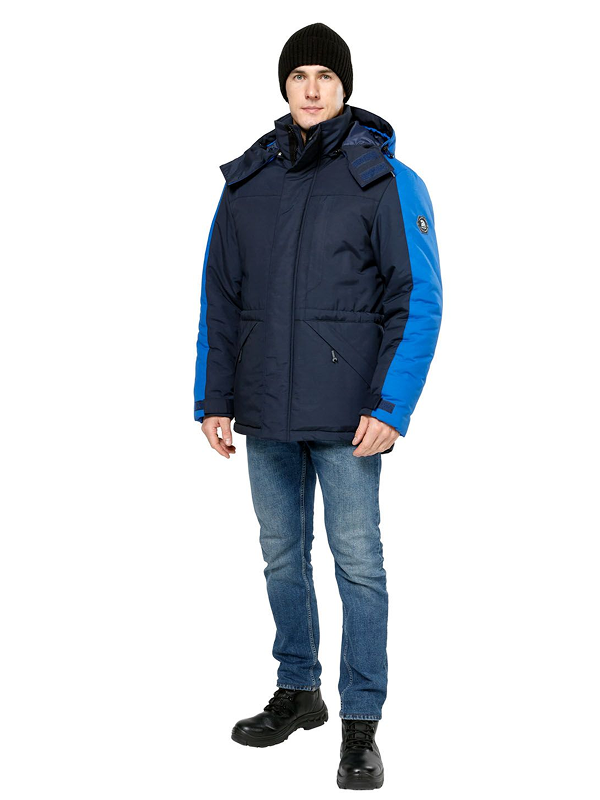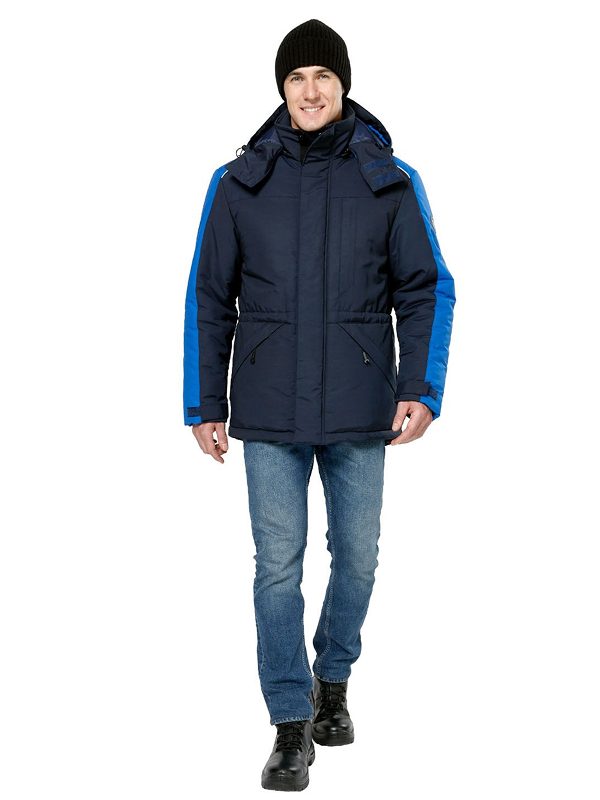 Мужская утеплённая куртка прямого кроя. Оснащена центральной молнией, защищённой ветрозащитной планкой на кнопках с дополнительной тесьмой.