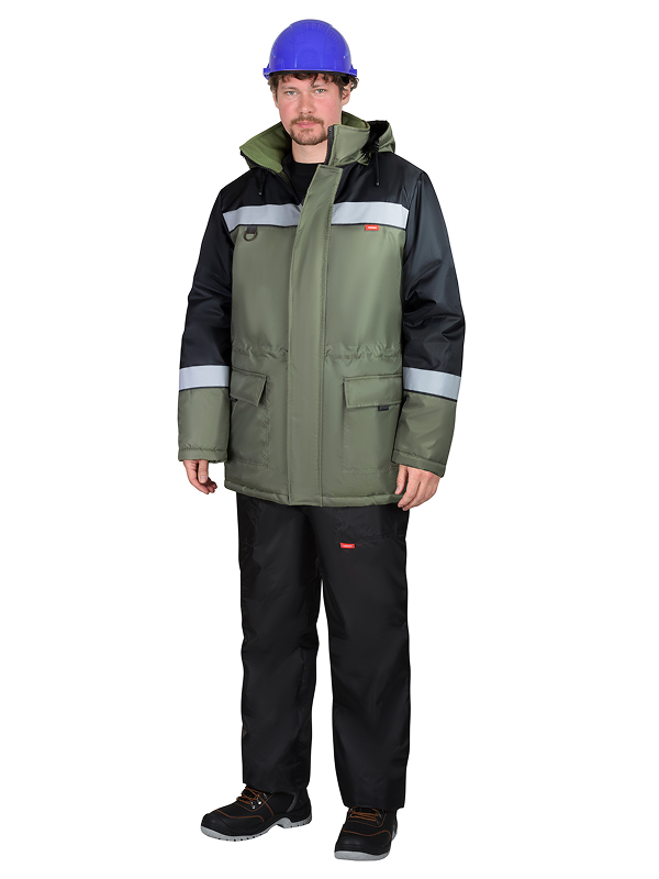 Куртка прямого силуэта, удлинённая, с утеплённой подкладкой, с центральной застежкой молния с ветрозащитным клапаном, с втачным воротником-стойка внутренний воротник из флиса, с втачными рукавами с внутренней трикотажной манжетой, с нижними накладными карманами с клапаном и карманом на подкладке. Куртка с кулиской по талии, со съёмным капюшоном, с лентой светоотражающей. В куртке предусмотрено крепление бейджа.