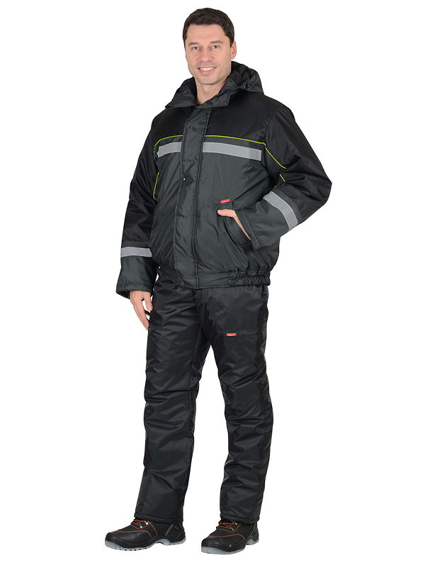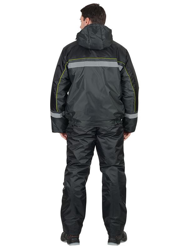 Куртка укороченная прямого силуэта, с притачной утеплённой подкладкой, притачным утеплённым капюшоном и центральной застёжкой на двухзамковую молнию. Куртка с внутренней и внешней ветрозащитными планками и с притачным поясом с эластичной лентой по боковым сторонам. Рукава с внутренними трикотажными напульсниками. По полочкам, спинке и рукавам куртки настрочена лента светоотражающая СОП шириной 50 мм, для обозначения сигнальной видимости.