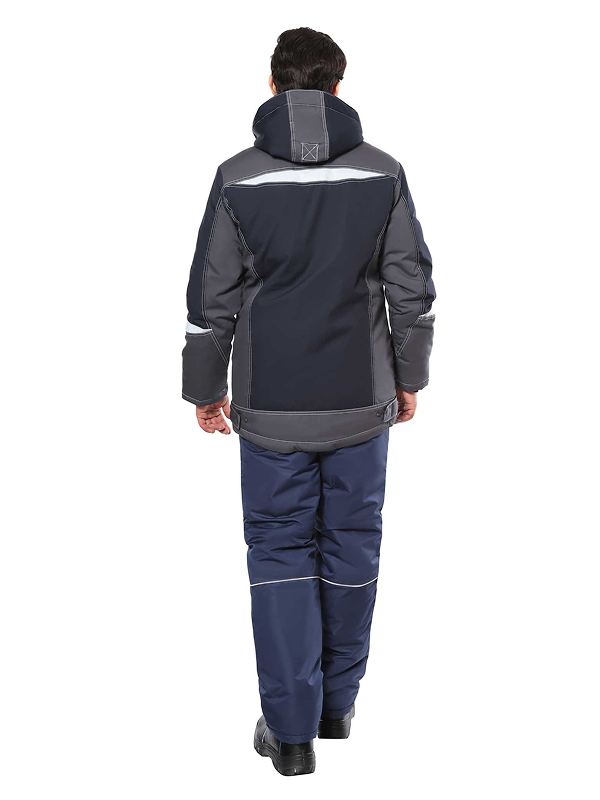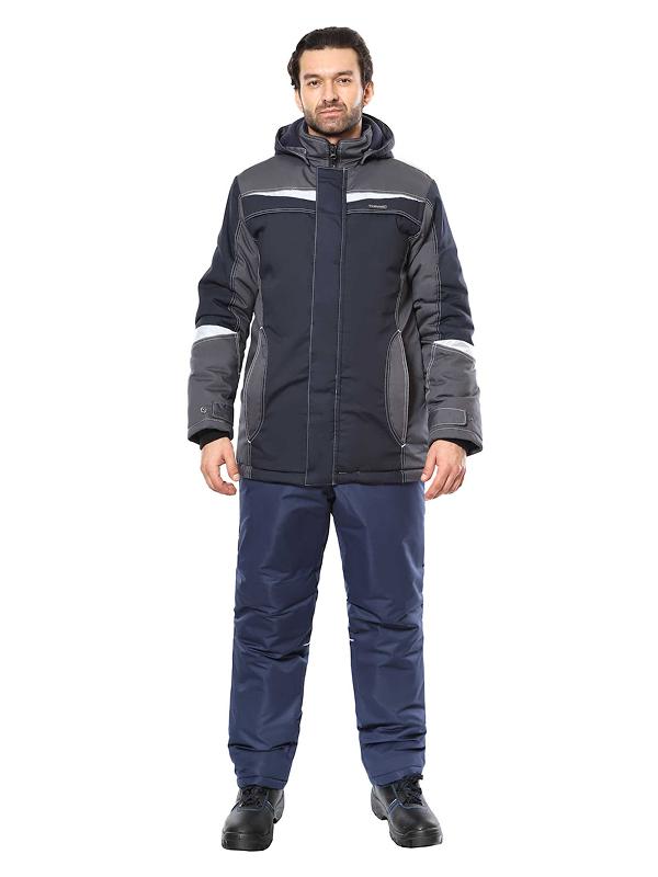 Куртка прямого силуэта, удлиненная, с воротником стойка, с центральной застёжкой на молнию, которая закрыта ветрозащитным клапаном с потайными кнопками. Куртка с верхними и нижними скрытыми прорезными карманами на молнию, с внутренним карманом на молнии с левой стороны от застежки под ветрозащитным клапаном. Спинка понизу фигурная, удлиненная, по боковым сторонам с хлястиками для регулировки прилегания. Рукава втачные, разрезные, с трикотажными манжетами, ширина внизу регулируется хлястиками с потайными кнопками. Внутренний воротник из флиса. Куртка со съемным капюшоном, который пристегивается к горловине куртки с помощью кнопок. Подкладка куртки утепленная, комбинированная: верхняя часть из Флиса, нижняя часть из ткани Таффета. На подкладке куртки с правой стороны накладной карман. Для обозначения видимости в темное время суток в куртке предусмотрены декоративные светоотражающие элементы.