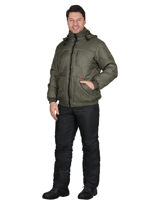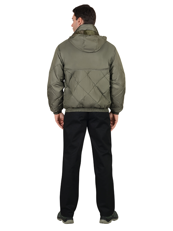 Куртка утеплённая, укороченная, по низу на притачном поясе с эластичной лентой, на подкладке из флиса, со съёмным капюшоном, с центральной бортовой застёжкой на молнию и воротником стойка. Изделие с верхним нагрудным прорезным и нижними накладными карманами. Рукава втачные с притачными манжетами, манжеты частично стянуты на эластичную ленту. Полочки, спинка, рукава и нижние карманы куртки выстеганы с утеплителем в виде ромбов.