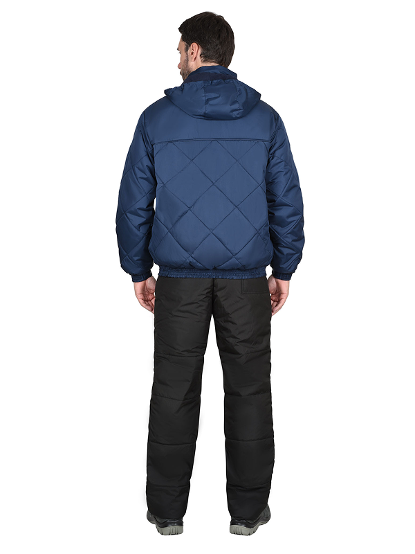 Куртка утеплённая, укороченная, по низу на притачном поясе с эластичной лентой, на подкладке из флиса, со съёмным капюшоном, с центральной бортовой застёжкой на молнию и воротником стойка. Изделие с верхним нагрудным прорезным и нижними накладными карманами. Рукава втачные с притачными манжетами, манжеты частично стянуты на эластичную ленту. Полочки, спинка, рукава и нижние карманы куртки выстеганы с утеплителем в виде ромбов.