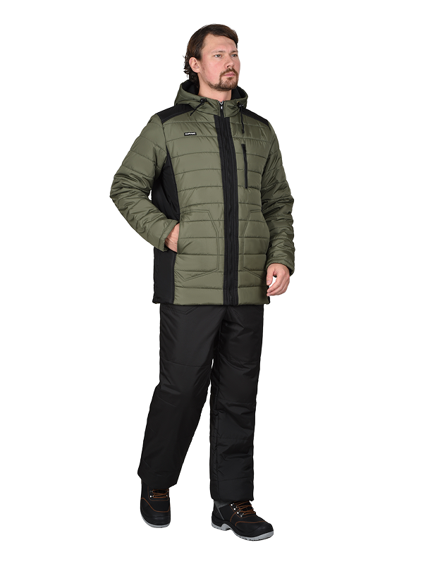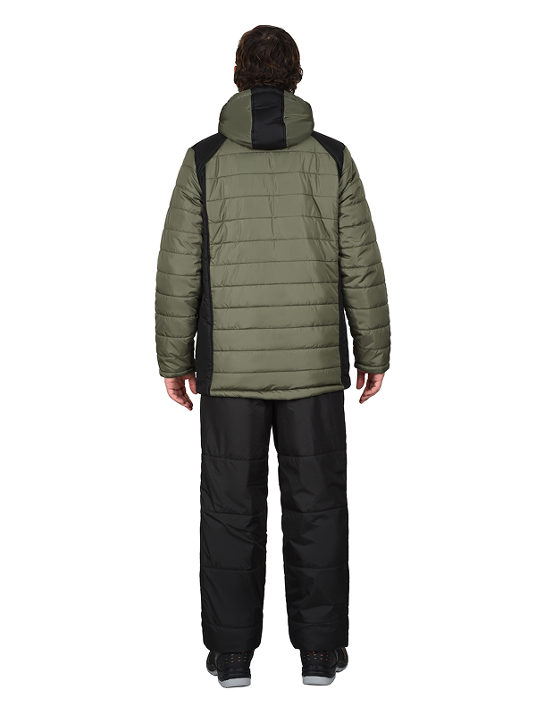 Куртка комбинированная из ткани двух цветов, с центральной застежкой на молнию, с удлиненной фигурной линией низа по спинке, с втачным капюшоном, с втачными рукавами. Куртка с левым нагрудным прорезным карманом на молнию, нижние карманы в швах. На подкладке с правой стороны накладной карман на молнию.